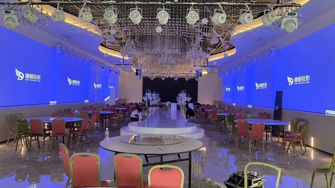 本次音維科技的技術團隊為杰瑞酒店的宴會廳方案采用了8臺均來自中國國產投影機銷量排行穩居top前二的迪恒激光投影。該激光高清投影機擁有6200lm高亮度,即使是在宴會廳明亮的燈光下,畫面依舊清晰亮麗。色彩區域達到REC.709色域標準,色彩鮮艷真實,超高對比度使得畫面更通透細膩。為用戶帶來無與倫比的虛擬影像,將世界萬象盡收眼底,觀看效果更真實生動。
