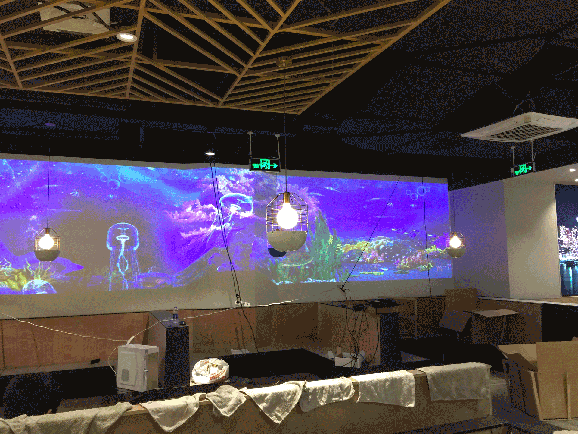 郴州海豚灣餐廳投影融合是由5臺DHN商務投影機,采用軟件邊緣融合組成,雖然是使用的是商務投影機,但從亮度,畫面清晰度來看客戶都滿意!