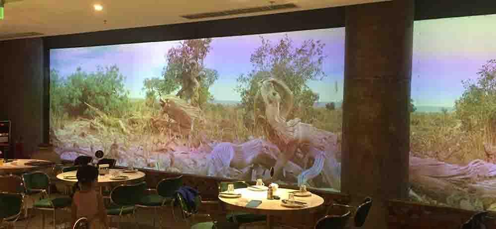 此次項目是在新疆的絲路有約餐廳,共使用6臺DHN多拼激光投影機DM907,充分利用DM907內(nèi)置融合功能,實現(xiàn)大屏融合,在餐廳四周的墻面上進行投影,播放有關絲綢之路的片源,巧妙的與絲綢之路名字相呼應,營造沉浸式餐廳的氛圍,與絲綢之路相約在這里,讓顧客仿佛與那時以絲綢之路為貿(mào)易對象的中外商人來了一場時空對話。