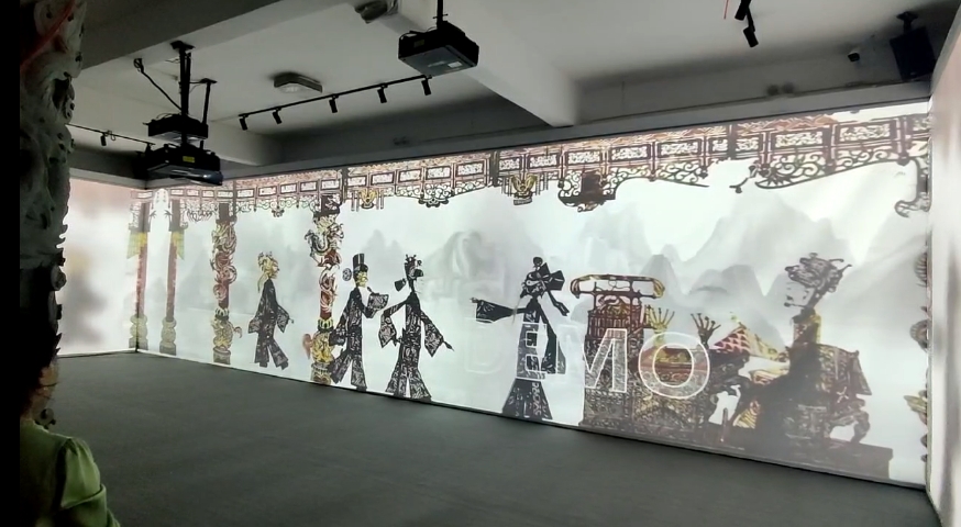 其中,三折幕投影系統(tǒng)由音維科技承制,根據(jù)客戶要求,在比較寬大的展廳中投射至三面墻上,共同組成一幅美麗的畫面,因此使用了融合投影技術(shù),使得展館游客可以用一種新奇有趣的方式,來欣賞皮影藝術(shù)之美。