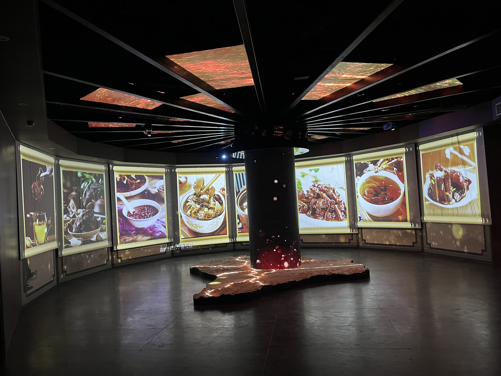 抬頭望去,展示館的頂部同樣不容小覷。這里不僅有美觀大方的板材裝飾,更有精心設(shè)計的影片播放區(qū)域。頂部的影片與四周的環(huán)幕投影、圓柱幕上的內(nèi)容相得益彰,使得整個展廳充滿了動感與活力。觀眾在這里,仿佛置身于一個充滿奇幻色彩的電影世界中,感受著衢陳皮文化所帶來的無盡魅力。