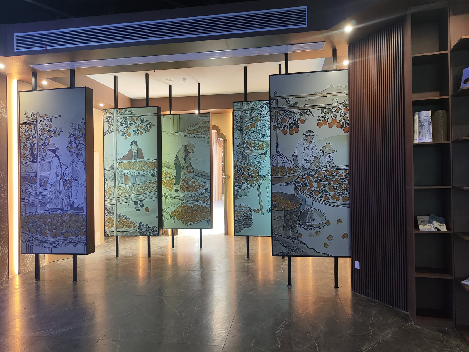 走進這座宏偉的展示館,首先映入眼簾的便是那震撼人心的大型環(huán)幕投影。高達3米、寬達2米的電動幕布,一共有8塊,宛如巨人的畫卷,靜靜地佇立在展廳的四周。當(dāng)投影啟動時,這些幕布仿佛被賦予了生命,同步垂直升降,將一幅幅精美的畫面展現(xiàn)在觀眾眼前。無論是衢陳皮的歷史淵源,還是其制作工藝的精湛之處,都在這里得到了淋漓盡致的展現(xiàn)。