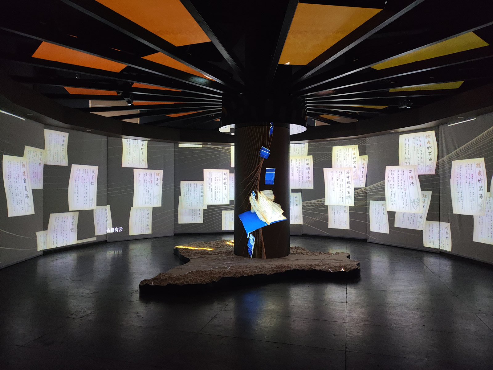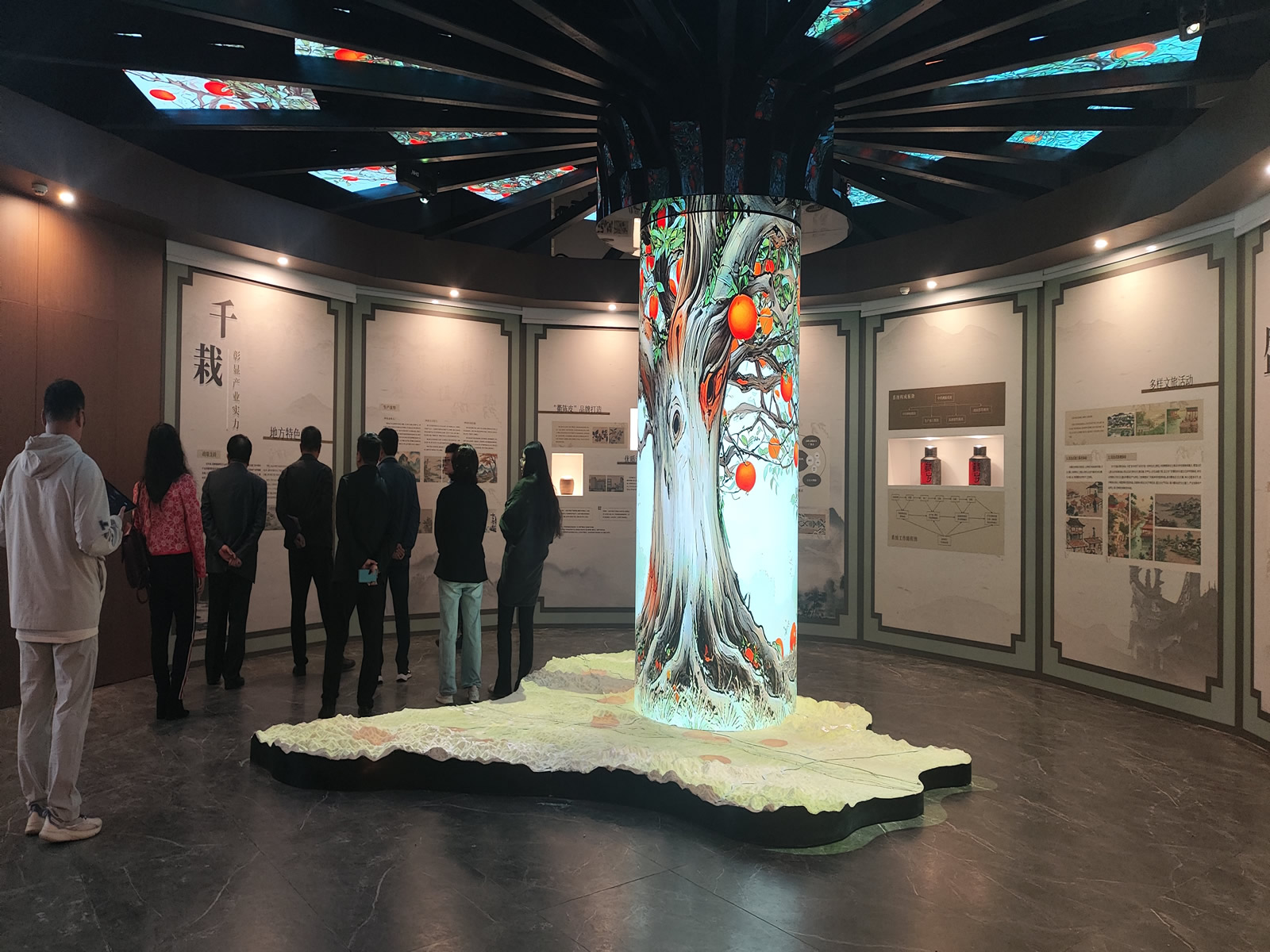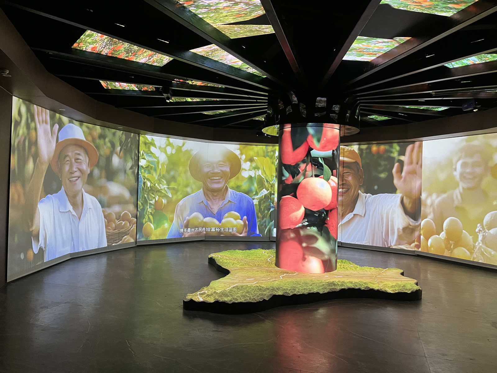 展廳的布局別具匠心,中央位置矗立著一根圓柱幕。這根圓柱幕不僅是空間的點綴,更是影片播放的重要載體。圓柱幕上,影片的內(nèi)容豐富多彩,或展現(xiàn)衢陳皮的獨特風(fēng)貌,或講述與之相關(guān)的動人故事。而圓柱幕的下方,同樣有影片在播放,與上方的畫面相呼應(yīng),共同構(gòu)成了一個立體、全方位的觀影體驗。
